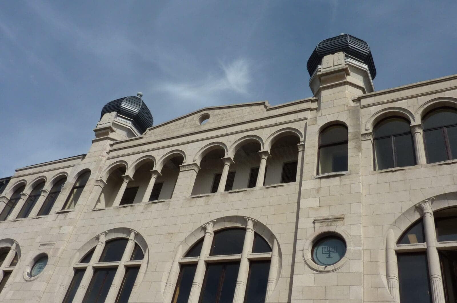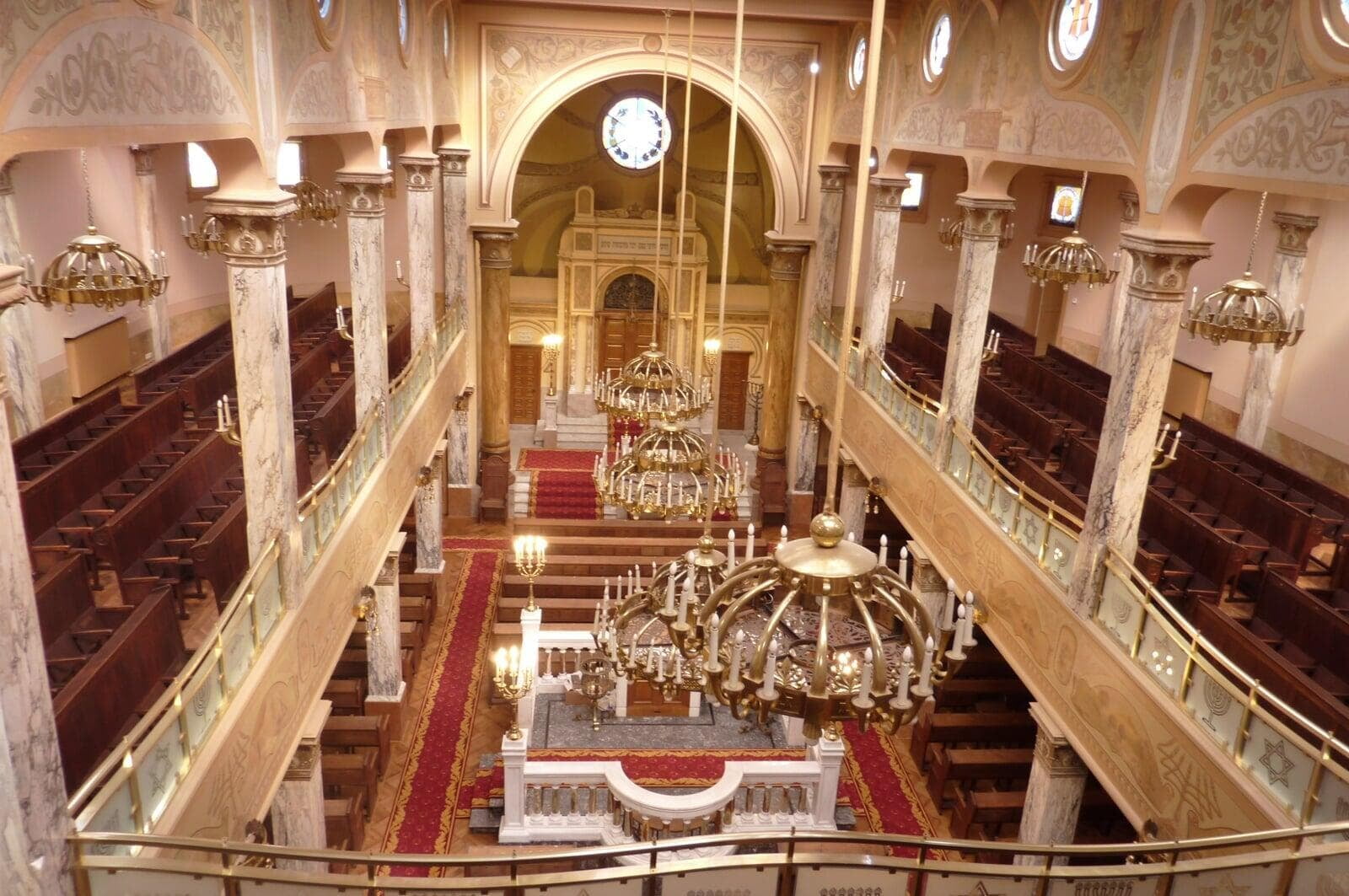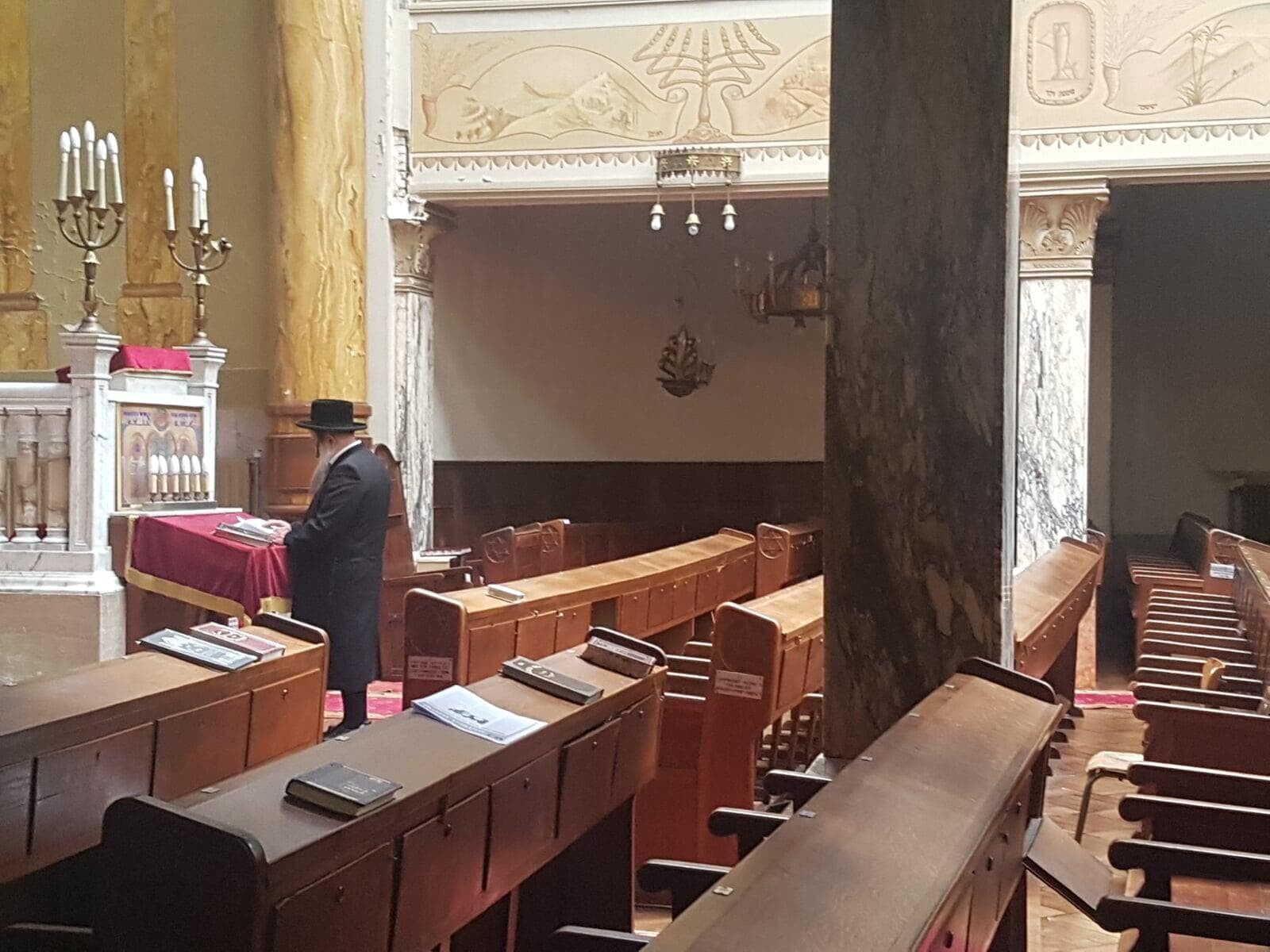 In contrast to the façade that look quite simple and unassuming, the interior was breathtakingly grandiose. The center of the main sanctuary rising up the floors with beautiful marble pillars topped with golden crowns lining the side of the room. Grand copper chandeliers hung from the ceiling while smaller ones complimented them from the sides and from the walls. A bimah gated with pillars of marble sat in the center with four menorahs on its four ends.