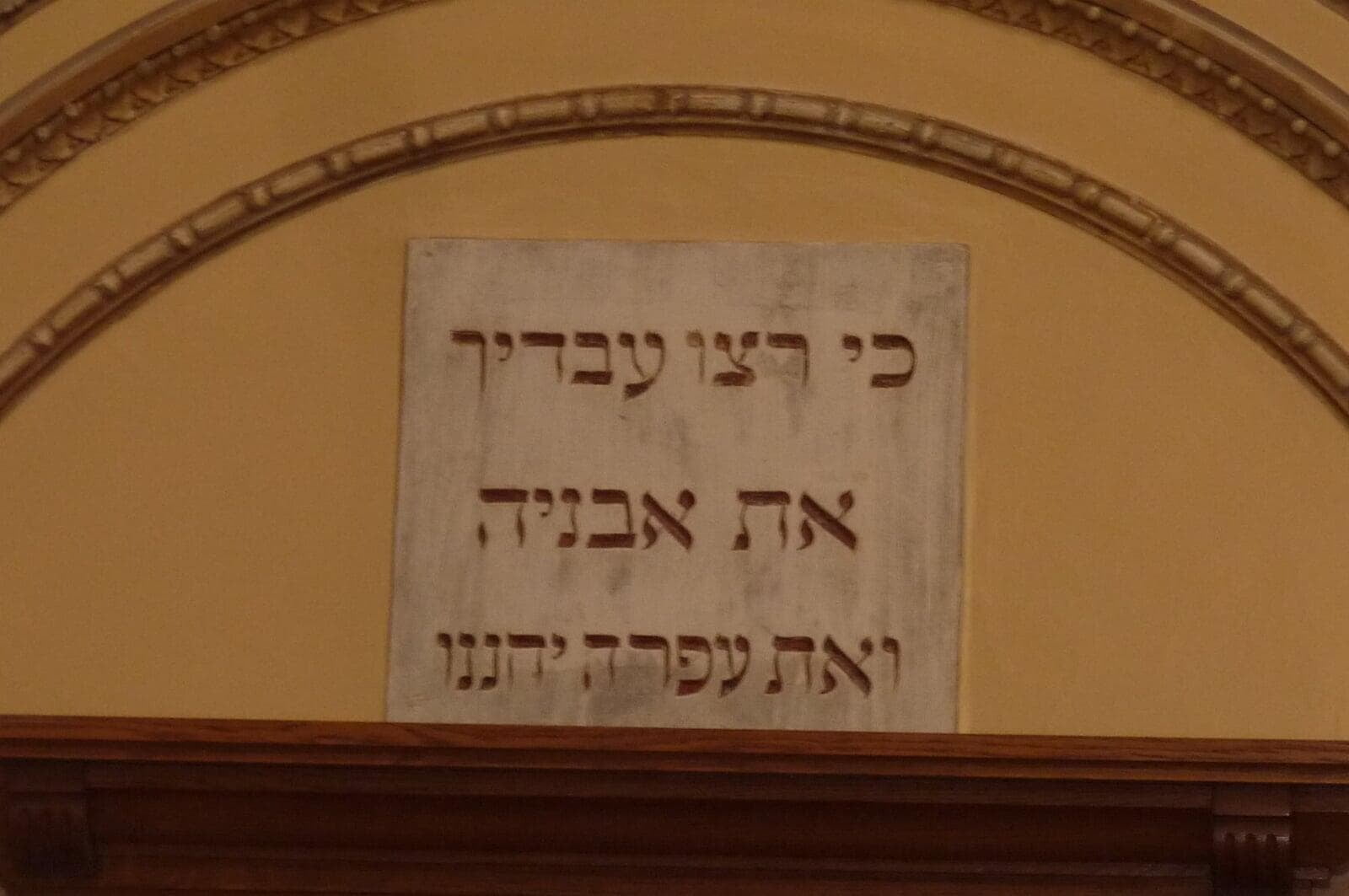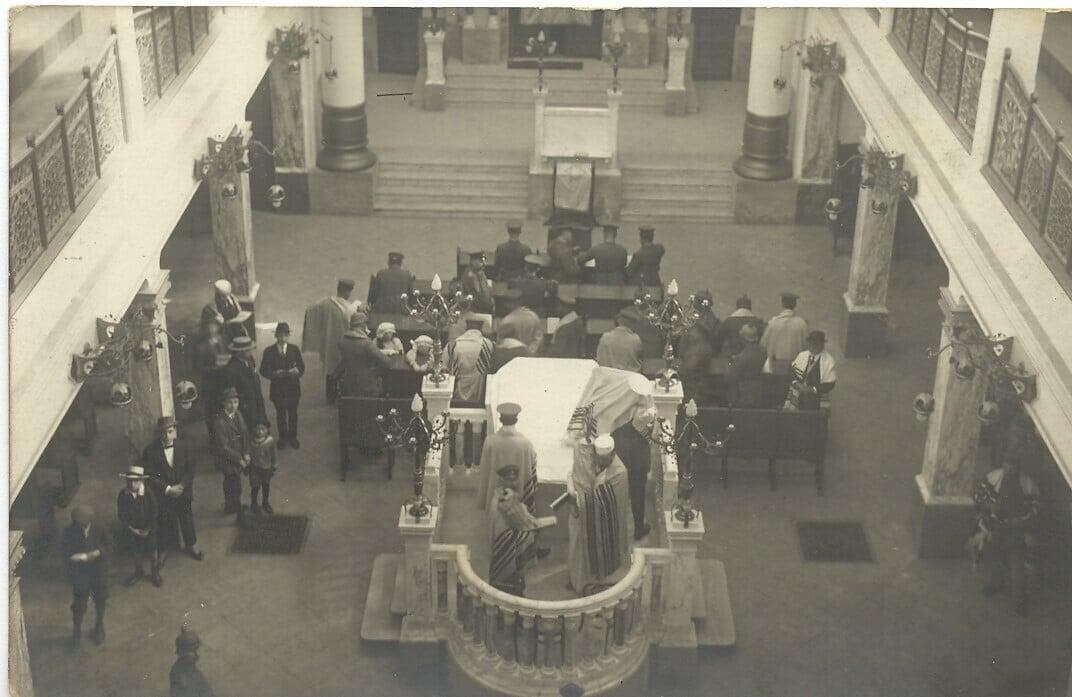 During the war most of the building was already standing. Until today one can still see two stones, one on each side of the aron hakodesh that have the inscription "האבנים האלו הובאו מארצינו הקדושה לזכרון לבני ישראל לדרתם"which carries the numerical value of תרע''ד. Although the shul was not ready for use in the year of 1916, in the midst of the war it was used by Jewish soldiers fighting for the German Army (There is a photograph of Jewish soldiers praying in the empty main sanctuary).which carries the numerical value of תרע''ד. Although the shul was not ready for use in the year of 1916, in the midst of the war it was used by Jewish soldiers fighting for the German Army (There is a photograph of Jewish soldiers praying in the empty main sanctuary).