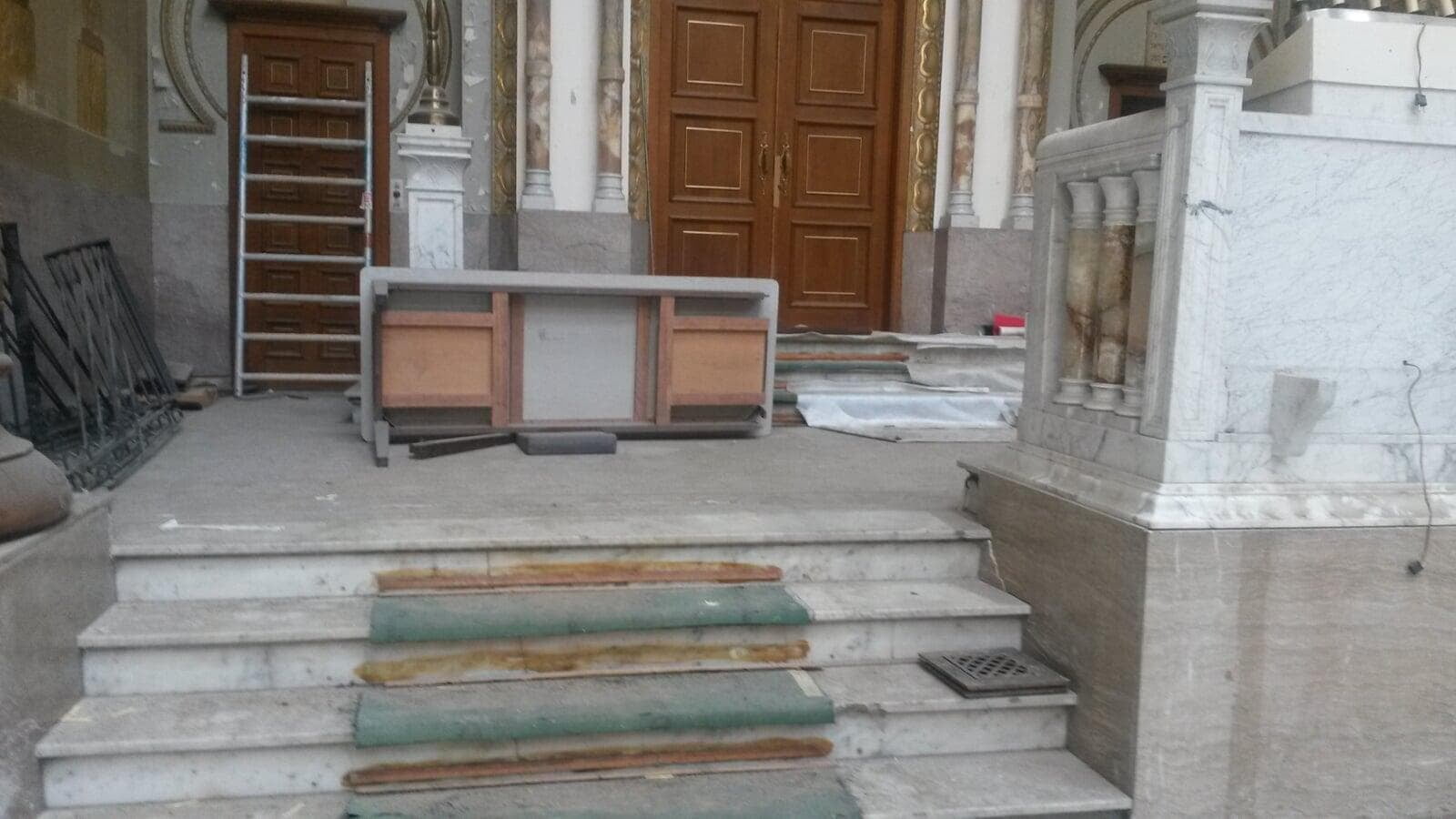 The highlight of the shul's beauty comes from the eastern wall. Two yellow marble pillars rise up, with the steps between them giving a regal impression. At the top of the steps, there was a platform to allow the kohanim to duchen, and on the south side stood a large brass menorah.