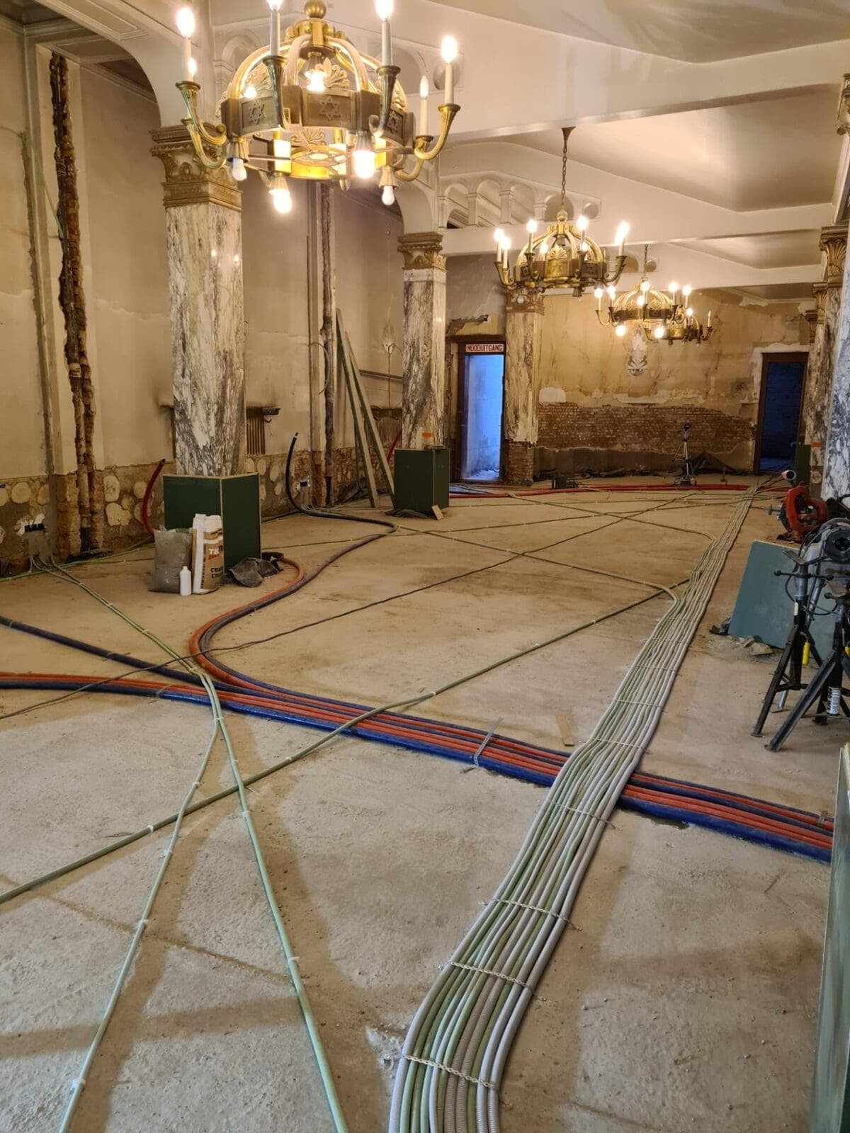 ונתאר קצת את שלל העבודות שנעשו, ראשית חידשו לגמרי את כל תשתיות הבנין, דהיינו כל מערכות החשמל, צינורות המים הקרים והחמים, מערכות החימום, בוילער'ס חדשים במרתף, צינורות ו"קוימען" חדשים לגמרי, הביוב וצינורות ניקוז מי גשם, הכל חודש לגמרי.